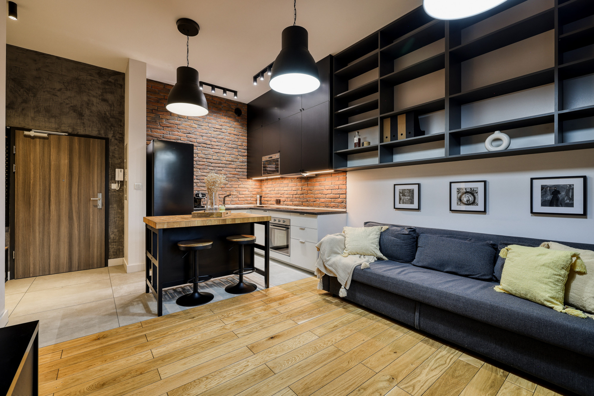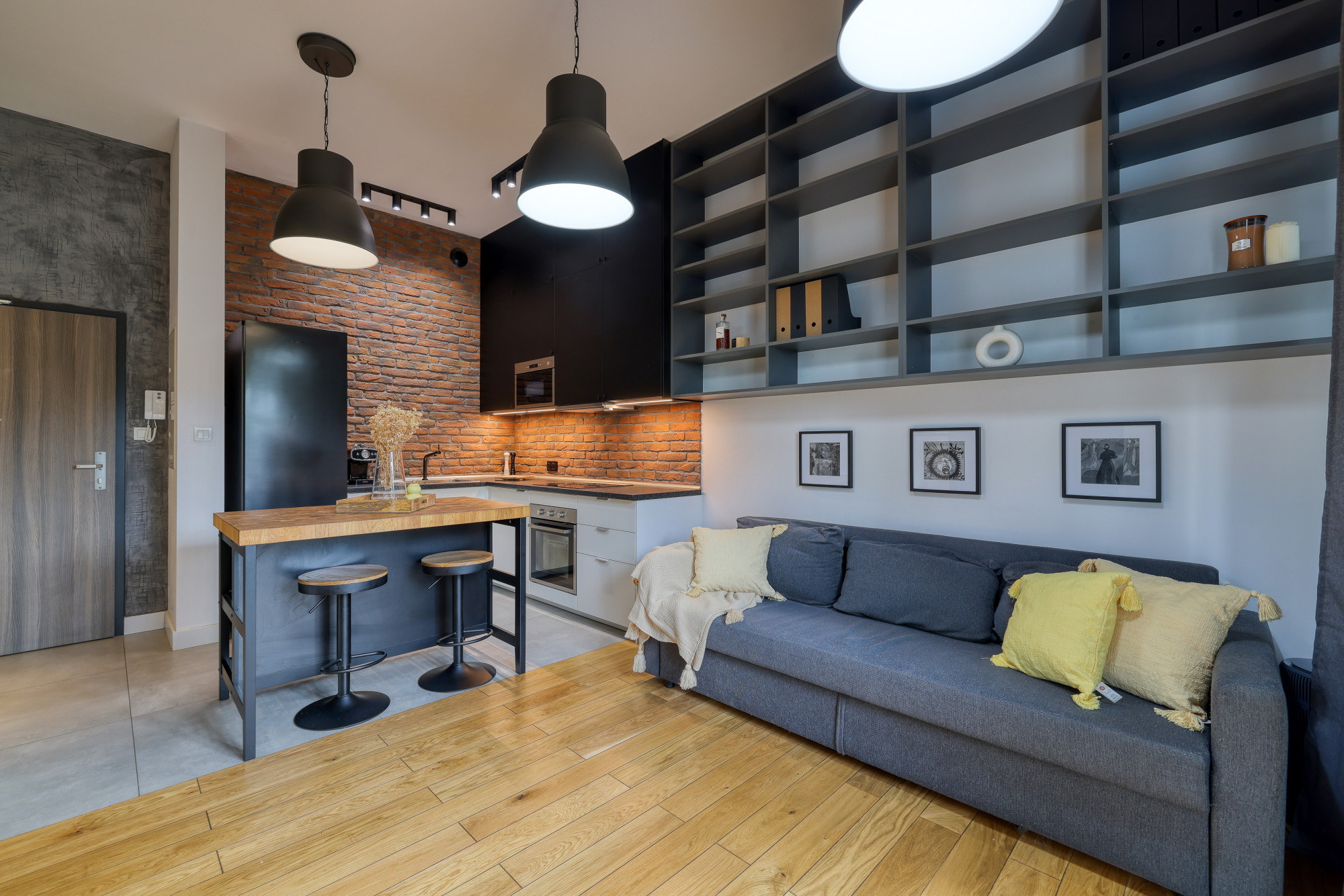 Przestronny salon z otwartą kuchnią, rozkładaną kanapą i wyjściem na ogródek,