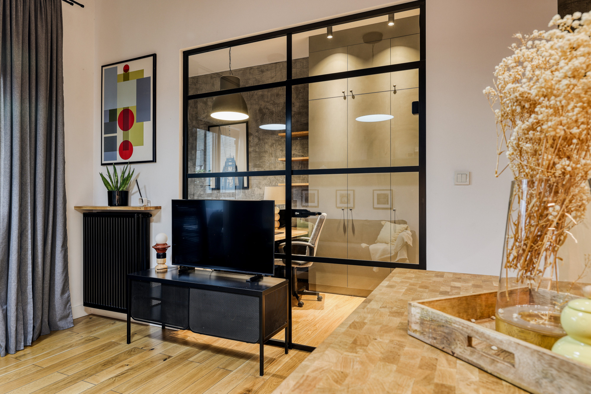 Wysokie na 3,5 metra sufity nadają przestrzeni wyjątkowego charakteru, a duże okna wpuszczają do wnętrza mnóstwo naturalnego, czystego światła, tworząc ciepłą i przytulną atmosferę.
