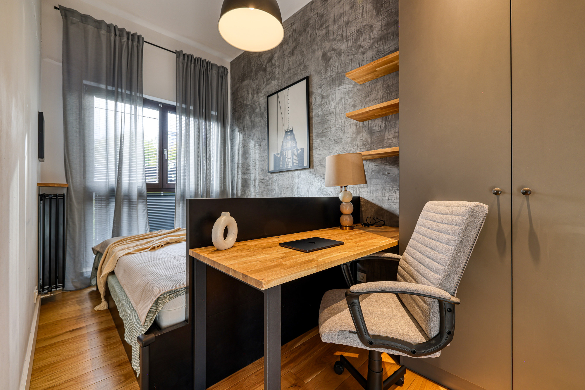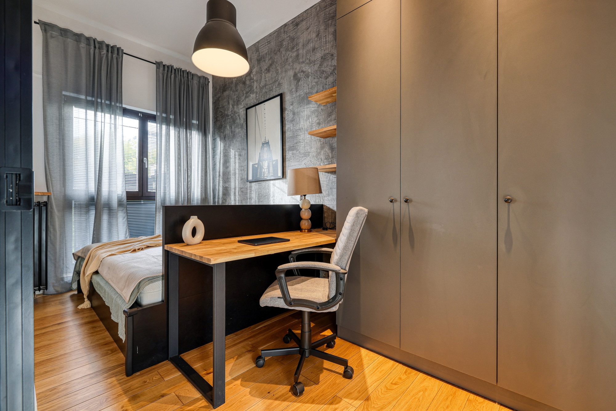 Sypialnia z miejscem do pracy, dużym łóżkiem i pojemną szafą,